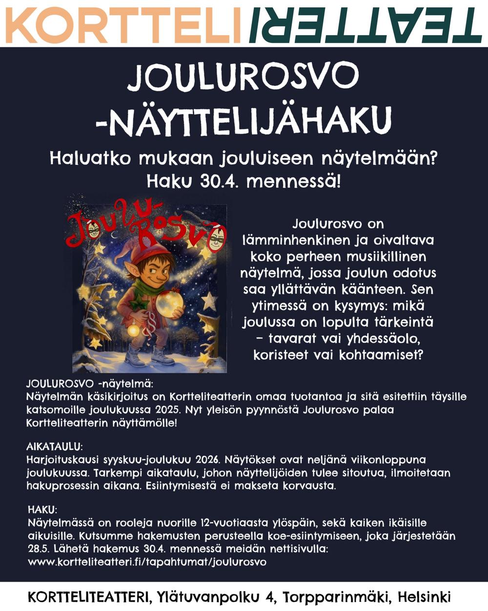 Haluatko mukaan jouluiseen näytelmään? Haku 30.4. mennessä! Joulurosvo on lämminhenkinen ja oivaltava koko perheen musiikillinen näytelmä, jossa joulun odotus saa yllättävän käänteen. Sen ytimessä on…
