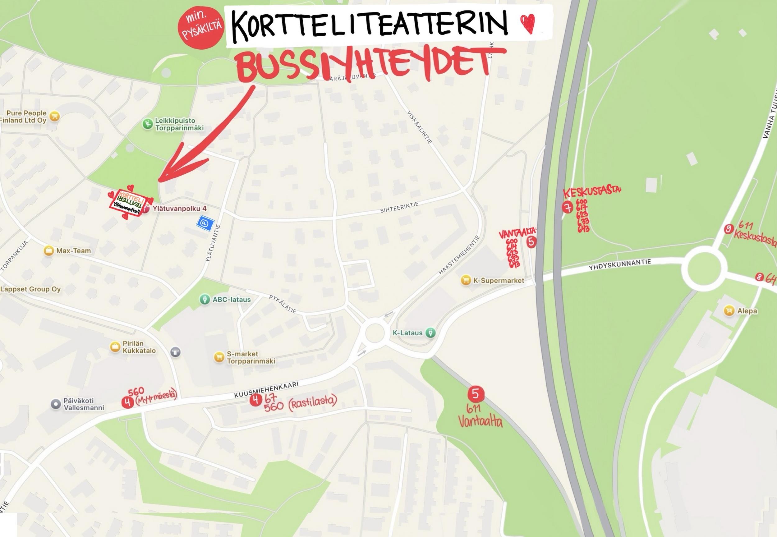 Huomioithan, että Kortteliteatteri sijaitsee asuinalueen keskellä, leikkipuiston laidalla, eikä Kortteliteatterin eteen ei saa ajaa autolla. Autot tulee jättää parkkipaikalle tai katujen varsiin. Kuvissa saapumisohjeet julkisilla tai autolla. Klikkaa kuva suuremmaksi.
