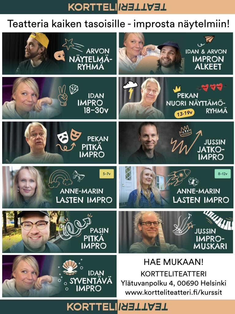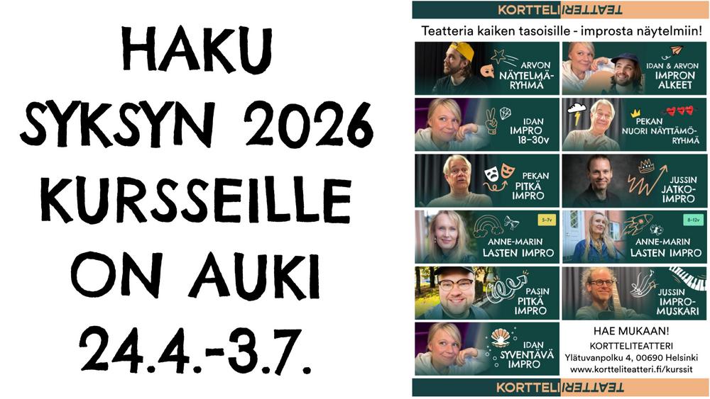 Haku Kortteliteatterin syksyn kursseille aukeaa pe 24.4. klo 17:00 ja on auki 3.7. asti.