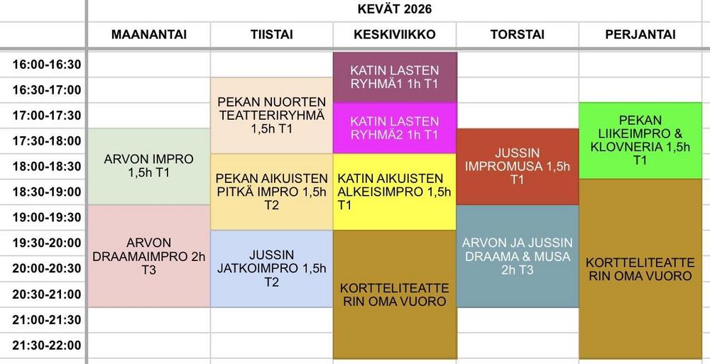 ILMOITTAUTUMINEN KEVÄTKAUDELLE 2026 ON AUKI! Opetus tammikuusta toukokuuhun. Loma-aikoina ja pyhinä ei ole opetusta. Kausi alkaa 12.1. alkavalla viikolla ja päättyy toukokuussa, jolloin kaikilla vakioryhmillä on esitykset! Pekan liikeimpro & klovneria päättyy huhtikuussa. Mukaan voi ilmoittautua missä kohtaa kautta tahansa, jos ryhmissä on tilaa.
