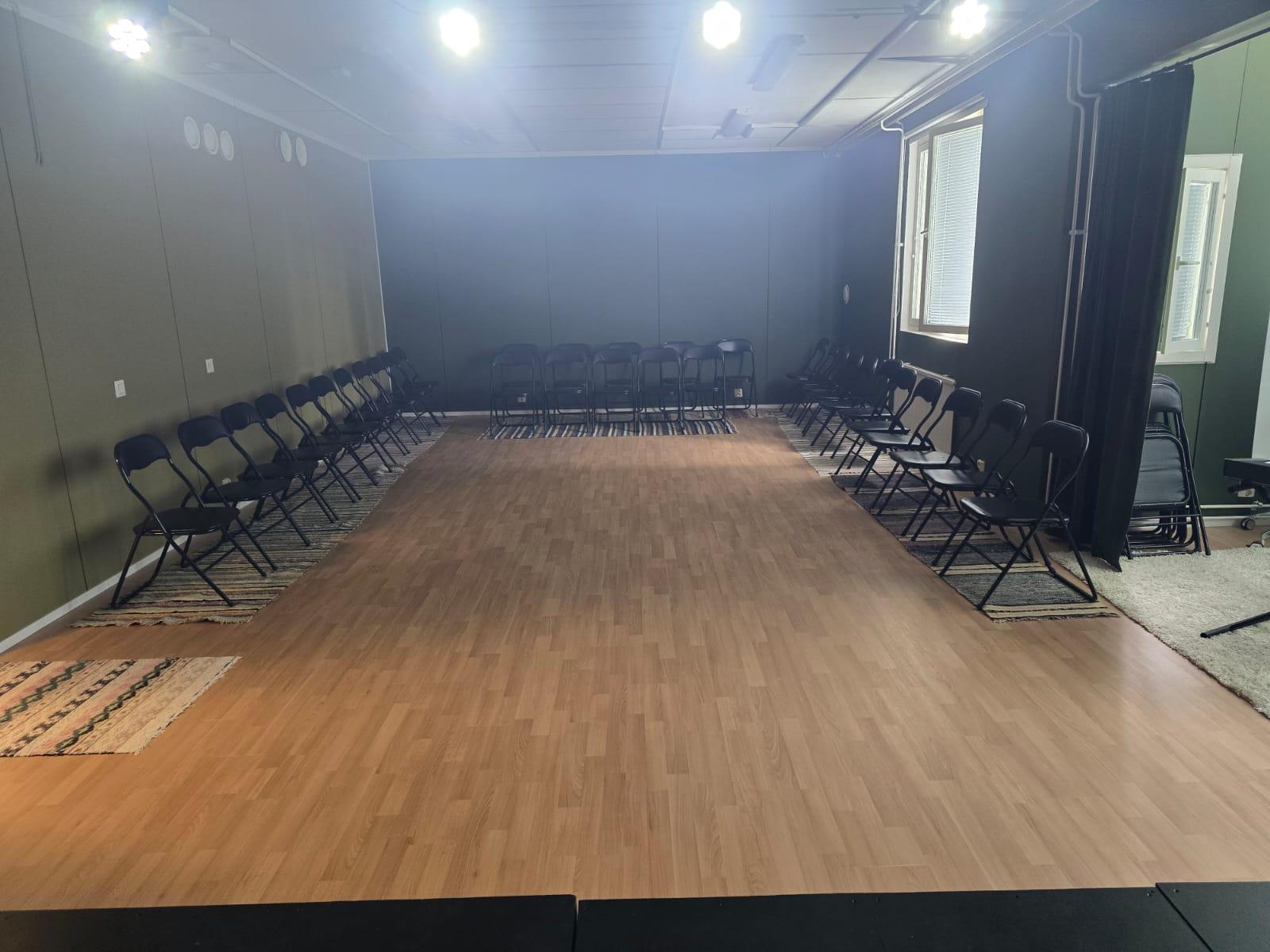 Teatterista löytyy pieni esiintymislava, valot, kevyt äänentoisto, kosketinsoitin, kahvio, jossa astiasto noin 40:lle. Teatterin puolella katsomopaikkoja on noin 50:lle, kahviossa istumapaikkoja n 25:lle.