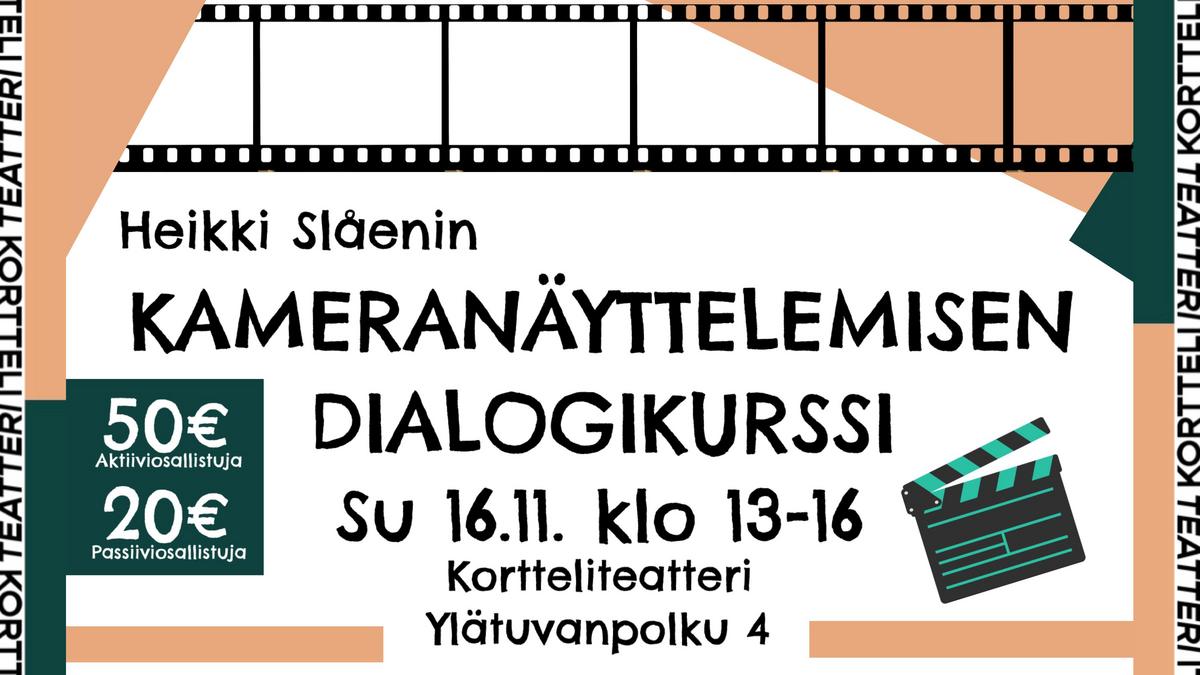 Dialogikurssi on 3h sessio, jossa saat itsevarmuutta ja tekniikoita dialogin työstämiseen kameran edessä. Kursilla ”aktiiviosallistujat” (8 näyttelijää) työstävät tekstejä vastanäyttelijän kanssa ohjaaja Heikki Slåenin turvallisessa ja innostavassa ohjauksessa.