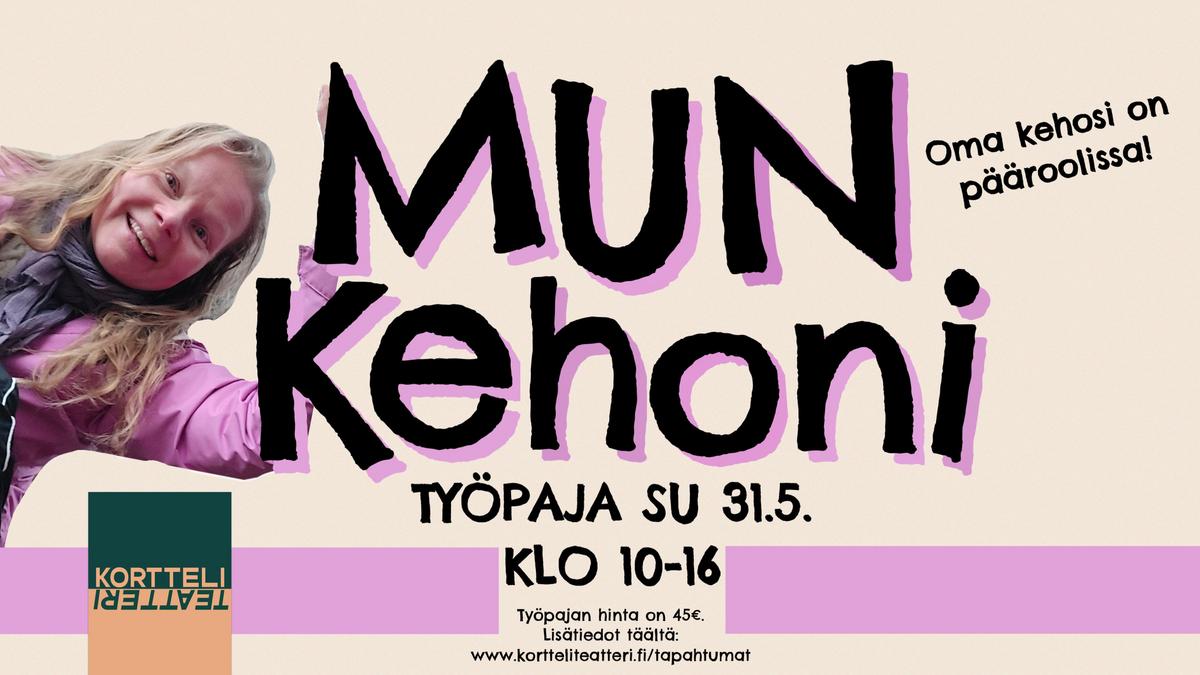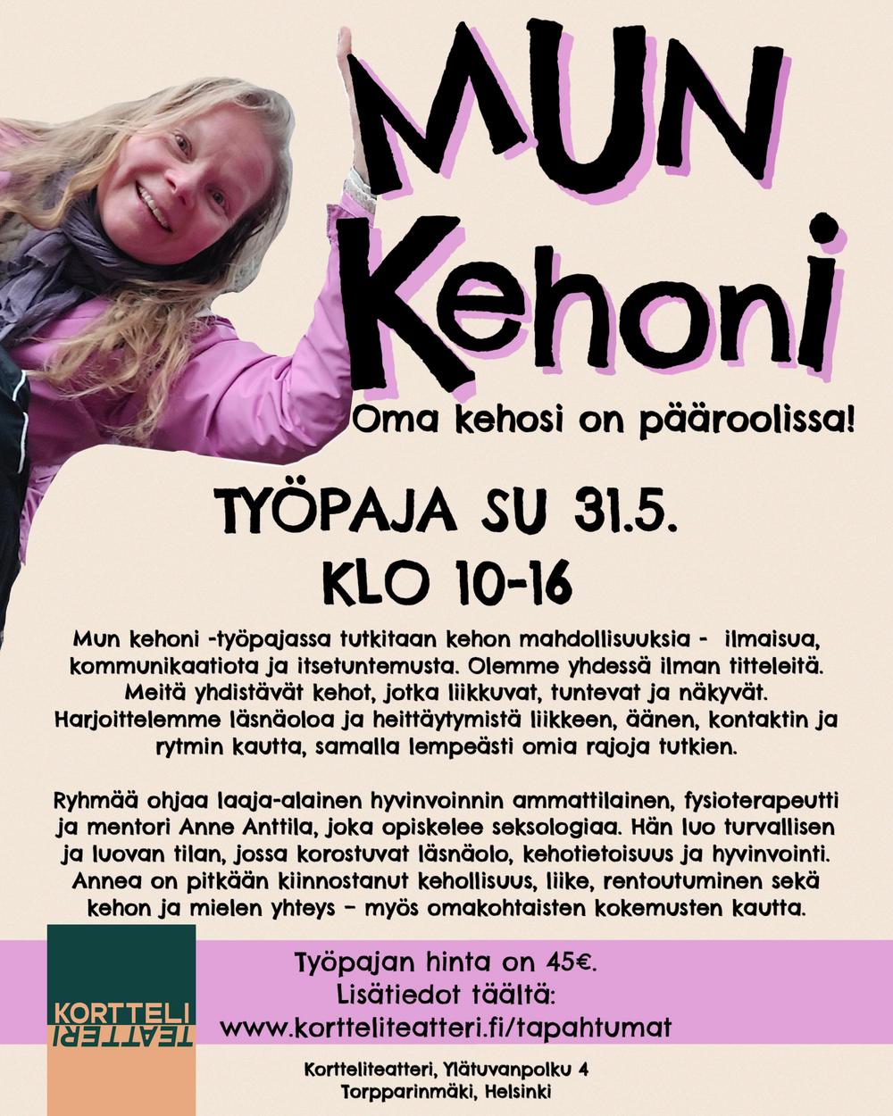 Mun kehoni -työpajassa tutkitaan kehon mahdollisuuksia - ilmaisua, kommunikaatiota ja itsetuntemusta. Olemme yhdessä ilman titteleitä. Meitä yhdistävät kehot, jotka liikkuvat, tuntevat ja näkyvät. Harjoittelemme läsnäoloa ja heittäytymistä liikkeen, äänen, kontaktin ja rytmin kautta, samalla lempeästi omia rajoja tutkien.